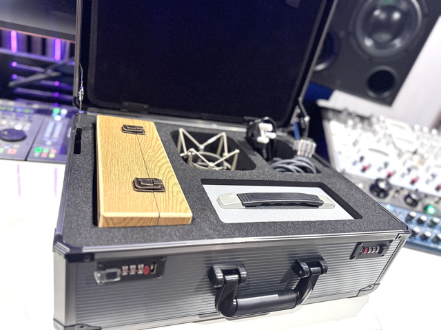 UK-made U47 replica microphone uses a 6 pin Tuchel connector and comes with a 6 meter Sommer cable. It includes a 120V/240V switchable power supply, a wooden storage box, a protective case, and a shock mount.